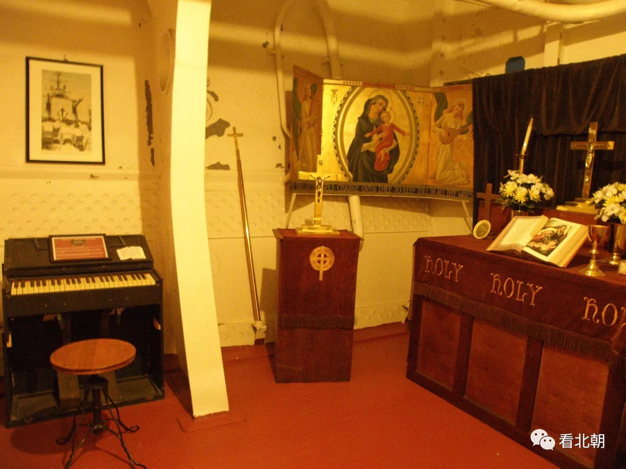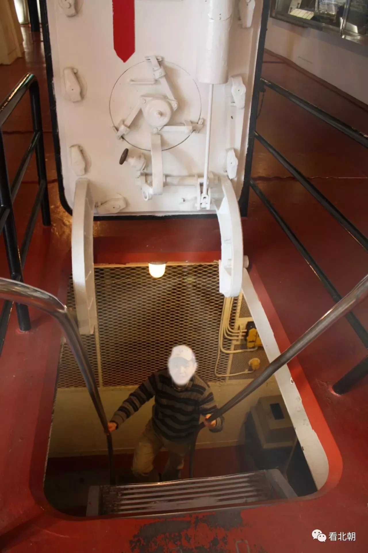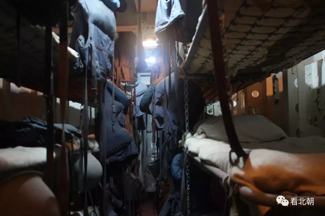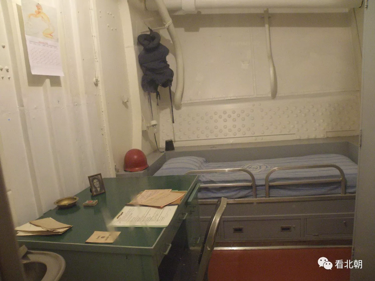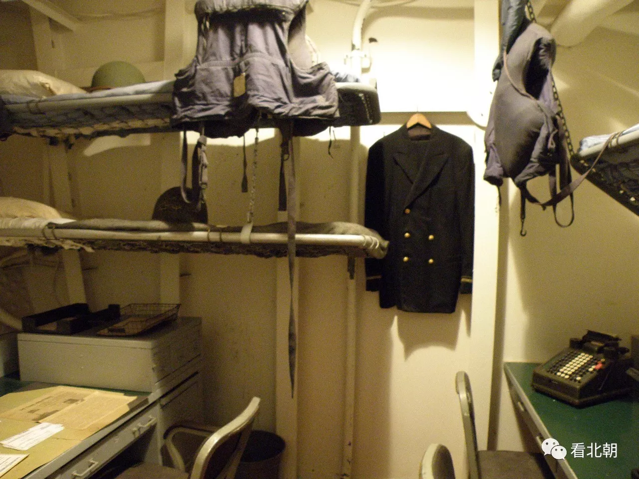 接下來是苦逼的水兵室,逼仄的空間、污濁的空氣,真不是人待的地方。到處掛著救生衣和鋼盔,幾百個大男人擠一堆,想想都很恐怖啊。