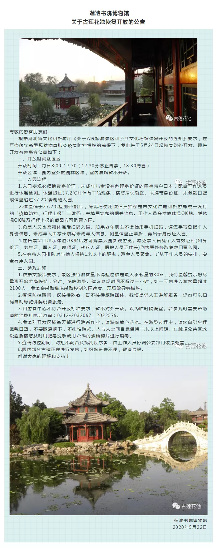 2020年5月22日,蓮池書院博物館發(fā)布公告稱, 根據(jù)河北文化旅游廳《關(guān)于A級(jí)旅游景區(qū)和公共文化場館恢復(fù)開放的通知》要求,在嚴(yán)格落實(shí)新型冠狀病毒肺炎疫情防控措施的前提下,古蓮花池將于5月24日起恢復(fù)對外開放。