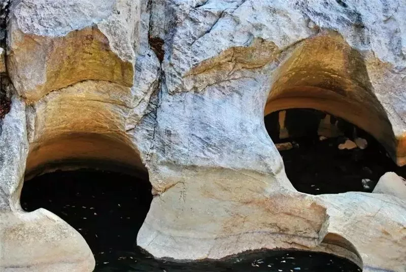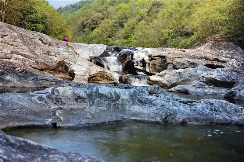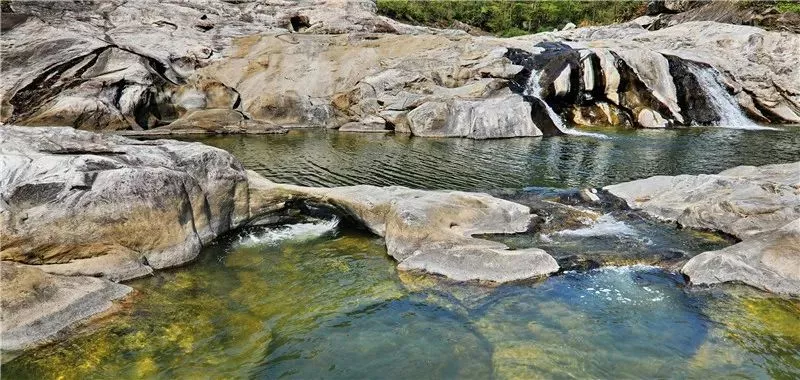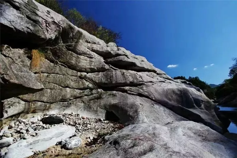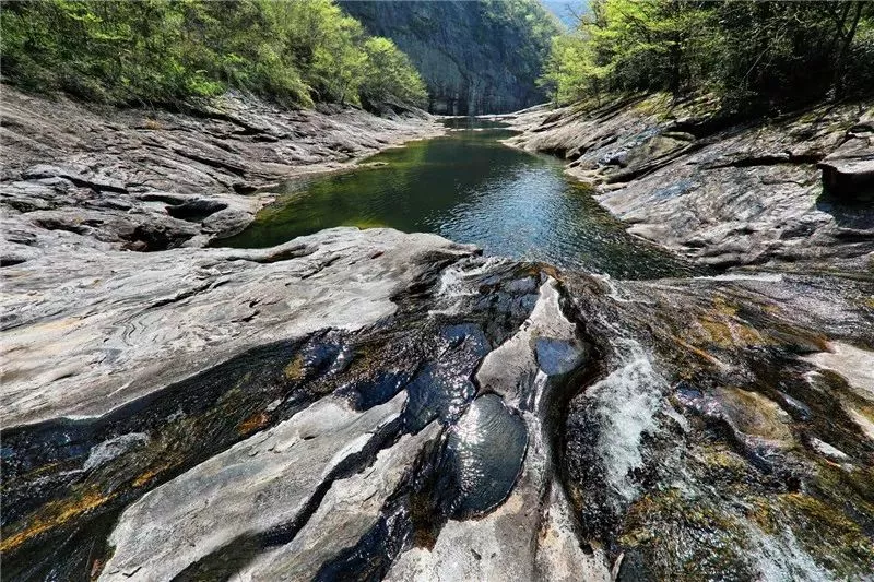 河道兩岸和底部都是花崗巖,被洪荒時(shí)代直至今日的水流沖刷得光溜溜的,不論是整塊的石板,還是單獨(dú)的石頭,都光溜圓滑。河道的石板不平整,是被百萬年的水流分割成縱橫交錯(cuò)的難以描述的圖案。