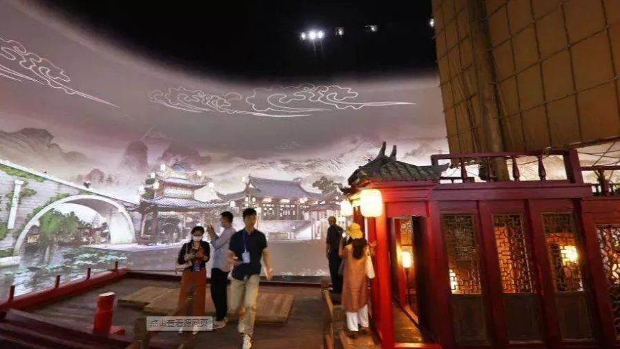 如“因運(yùn)而生——大運(yùn)河街肆印象”引入“實(shí)體”經(jīng)營(yíng)和“活態(tài)”展演模式,展廳可參觀、可體驗(yàn)、可互動(dòng)、可餐飲、可購(gòu)物,觀眾在展廳中可享受文化休閑和旅游的“一站式”服務(wù)。展廳以大運(yùn)河沿線典型城鎮(zhèn)村落為依據(jù)復(fù)原街巷建筑空間,如街道、商鋪、碼頭、米店、戲樓、民居、牌坊等,觀眾可在街巷中穿梭游覽。該展廳注重觀眾的穿越式情景體驗(yàn),運(yùn)用科技手段模擬晝夜變幻的真實(shí)場(chǎng)景氛圍,從建筑形式、裝飾元素、游戲互動(dòng)到店鋪商品均蘊(yùn)含時(shí)代特征,觀眾可在茶館喝大碗茶、聽(tīng)相聲和評(píng)書(shū)。為營(yíng)造沉浸式氛圍,展廳中隱現(xiàn)有地域方言特色的叫賣聲,觀眾可買(mǎi)到大運(yùn)河沿線的特色非遺小吃工藝品,如點(diǎn)心、醬菜、剪紙、風(fēng)箏、荷包、布鞋等,而對(duì)于一些需現(xiàn)場(chǎng)加工的特色美食,則可以通過(guò)購(gòu)買(mǎi)“交子”樣式的卡券到公眾餐廳兌換品嘗,以增加餐飲的趣味性。