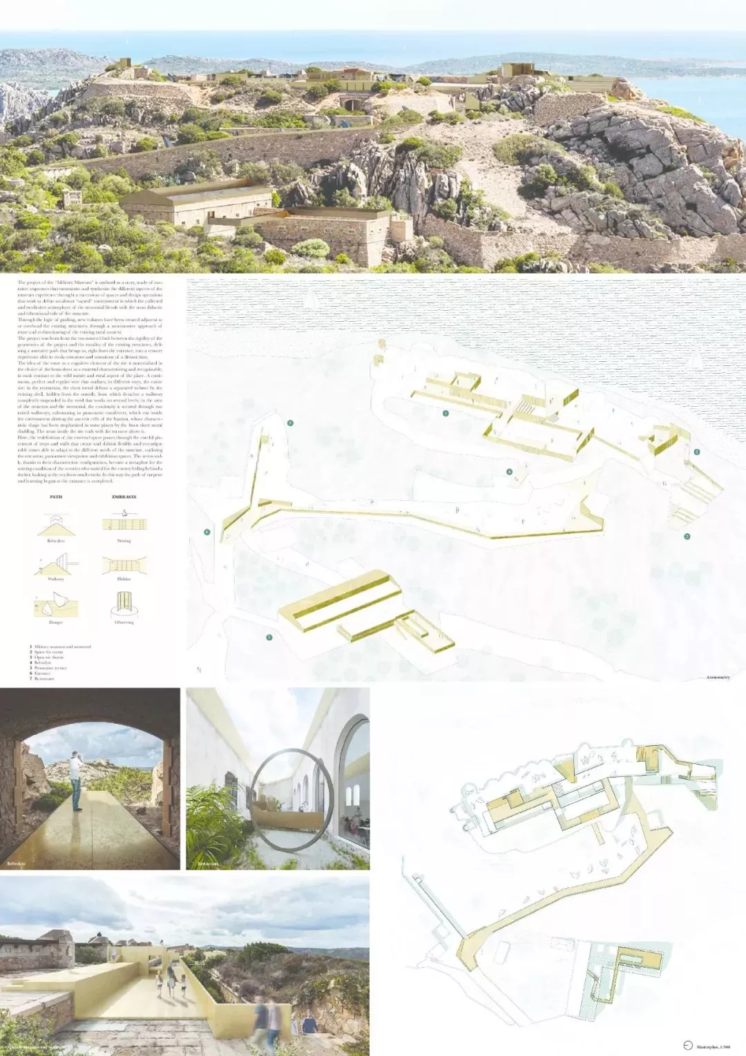 下面是小編為各位讀者準(zhǔn)備的參考圖紙,由YAC舉辦MILITARY MUSEUM,旨在將Capo d'Orso的軍事炮臺(tái)改造成軍事博物館。雖然這片區(qū)域的戰(zhàn)爭(zhēng)已經(jīng)結(jié)束,但留下了軍營(yíng)及炮臺(tái)等歷史記憶,這些空間具有重要的現(xiàn)實(shí)意義,可以將其改造成博物館建筑,讓更多年輕的一代參觀。