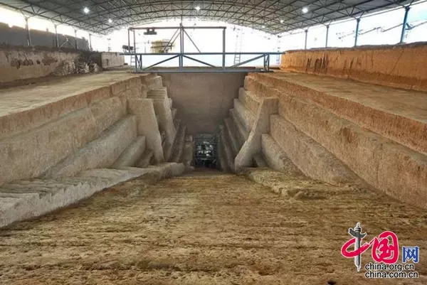 墓道為斜坡狀,上寬下窄,兩壁分別有七個臺階,逐級內(nèi)收。墓道上口寬9.8米,底部寬4.1米。全長39.5米,最深處距地表15米左右。在墓道與墓門接合處,南北兩側(cè)各有一道長5米、高4米的護墻。每面墻的墻體內(nèi)立有五根原木立柱,作為龍骨。原木關(guān)節(jié)紋理清晰可辨。墓道填土含有大量料礓石,經(jīng)平夯夯實,夯土層厚12—42厘米不等,十分堅硬。