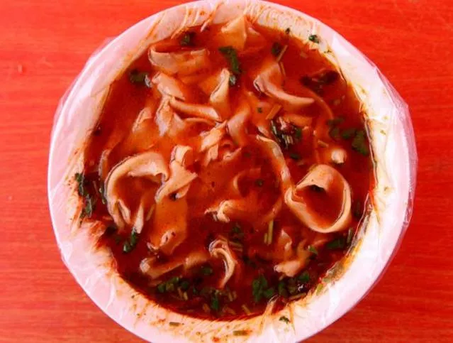 在縣城有對(duì)農(nóng)村夫妻在路邊支攤賣扯面,他這種扯面是家傳的技術(shù),他自己?jiǎn)胃梢惨呀?jīng)有16年了,僅在省城賣面就有12年的時(shí)間,他說自家有著獨(dú)特的一套扯面技術(shù),一碗面的面條由一小塊面扯出,3下他就能扯成4米多長(zhǎng),寬度1CM左右的面條來。扯好的面條在鍋里煮熟后,不用過水,可以直接放在碗里,要放上蔥花,姜末,花椒和米醋進(jìn)行調(diào)制,最后再上邊澆上辣椒油,這樣就能上桌送給客人吃了。