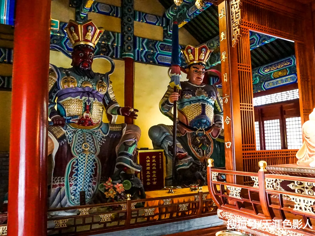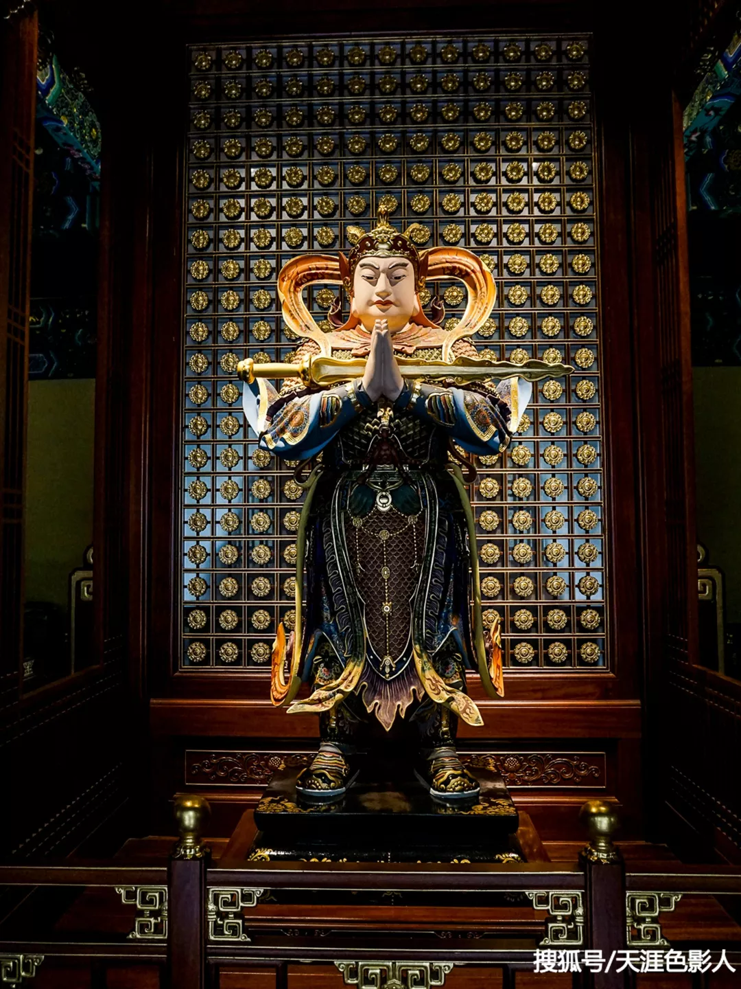 大悲寺坐西朝東,天王殿上為康熙帝手書”敕建大悲寺“。圖為天王殿內倒坐韋陀菩薩。