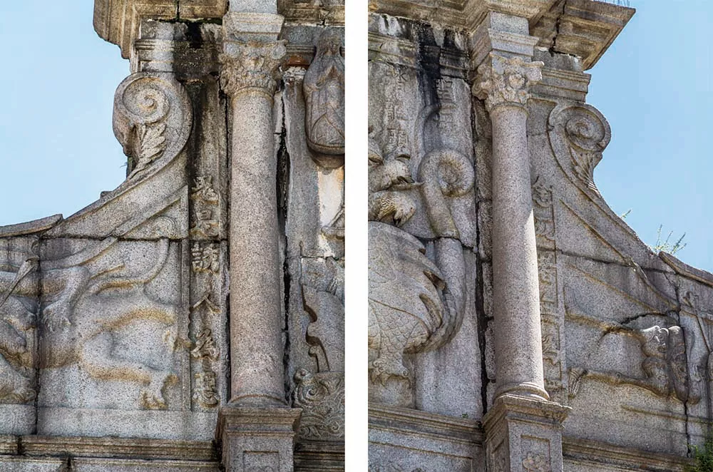 大三巴牌坊的材質是花崗巖,呈現(xiàn)巴洛克風格。仔細看的話,還可以在墻上找到中文字和菊花圖案,這種中西合壁的特色在全球的天主教教堂之中是獨一無二的。