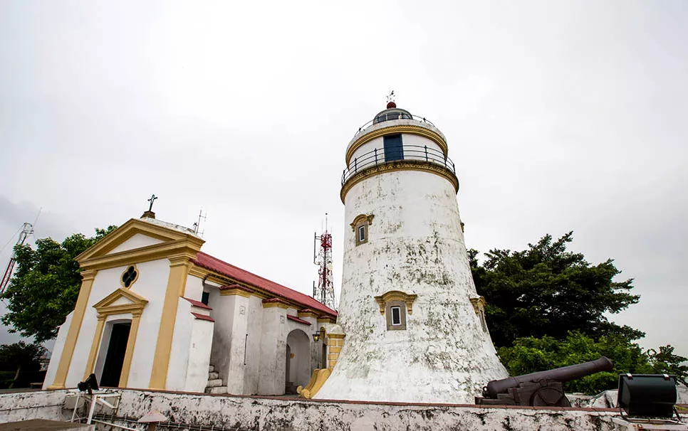 纜車的車廂不大,大概兩個人坐剛剛好,也不會太擠,一邊搭乘可以一邊鳥瞰整個東望洋區(qū)的景色。下了纜車后步行幾分鐘就可以到達東望洋炮臺。炮臺建于1622年,有火藥庫、哨房、樓塔等,范圍內還包括圣母雪地殿教堂與東望洋燈塔。這座東望洋燈塔是中國海岸第一座現(xiàn)代燈塔,而且燈塔的位置坐標值,就是澳門在世界地圖上的地理定位。