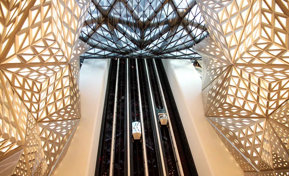 自由形態(tài)外骨骼結構的大樓,展現(xiàn)了奇幻優(yōu)雅的姿態(tài),而建筑中央的「8」字形鏤空造型,靈感則是來自中國的玉飾。澳門摩珀斯酒店內部中庭大廳挑高35公尺,搭上透明電梯可以一覽建筑內不規(guī)則幾何覆面的美麗壯闊,光是建筑就已足夠吸引眾人目光,酒店內的餐廳、甜點店也不可小覷。