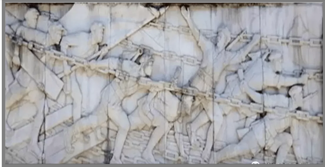 隨著東瀛塔底座炸毀的炮聲,各個建筑隊伍進入施工地 段。他們一邊建設(shè)露天劇場,一邊用磚混砌成399蹬臺階,30個平臺,一座橋涵和一個竹涼亭。并且在頂端用灰石條砌成33級臺階。