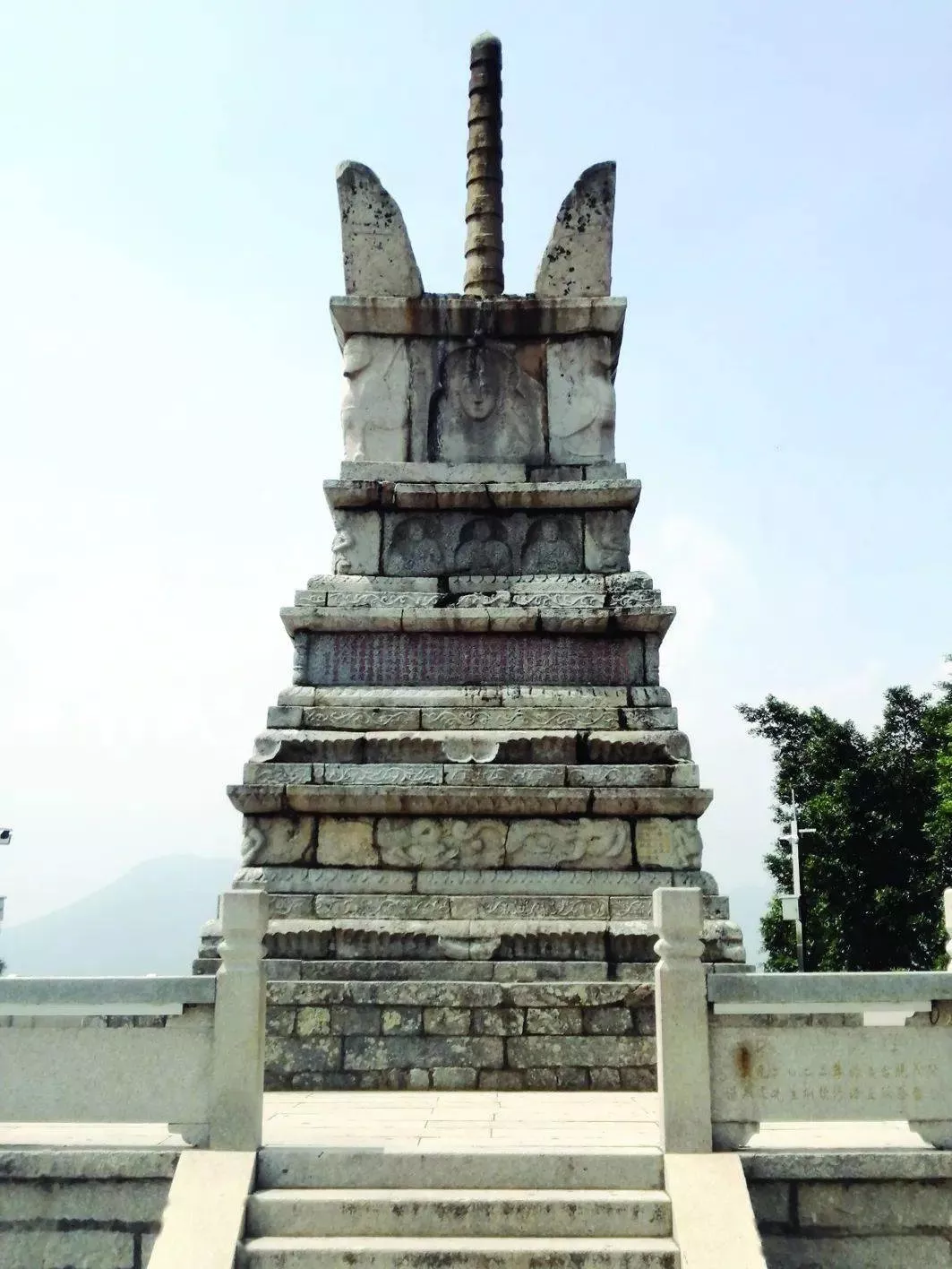 在此塔的最高頂端,高高豎立一桿鞭狀的石柱,四旁嵌上扇形的石雕,組成蕉葉合物輪頂,遠(yuǎn)遠(yuǎn)仰望,形如一頂佛帽。如此,中國科學(xué)院自然科學(xué)研究所專家張馭寰曾在《中國塔》一書中指出:天中萬壽塔是“目前發(fā)現(xiàn)的最大的寶篋印塔”。