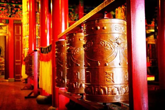 甘珠爾寺大殿內(nèi)的轉(zhuǎn)經(jīng)筒。轉(zhuǎn)經(jīng)筒又稱(chēng)“嘛呢”經(jīng)筒、轉(zhuǎn)經(jīng)桶等,與六字真言(六字大明咒)有關(guān),藏傳佛教認(rèn)為,持頌六字真言越多,越表對(duì)佛的虔誠(chéng),可得脫輪回之苦。
