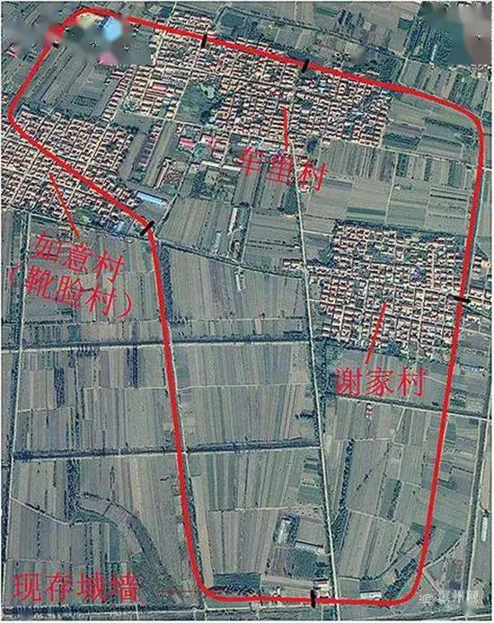 考古勘探測繪圖:謝家村離南城墻較遠,形似一只高筒靴。