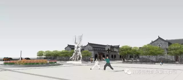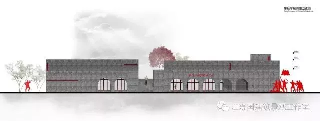 本方案設(shè)計依托基地原有民居空間格局,利用最大的節(jié)約化設(shè)計,形成中軸兩分,主體突出,莊嚴(yán)肅穆,體現(xiàn)紅軍東征恢弘氣魄,依山勢北高南低,接地勢自然形成。開闊的主題廣場雕塑,像一面旗幟豎立遠(yuǎn)揚,賦予了基地特有的歷史革命情懷,廣場半圓弧形狀極好的烘托了北部古建氣魄