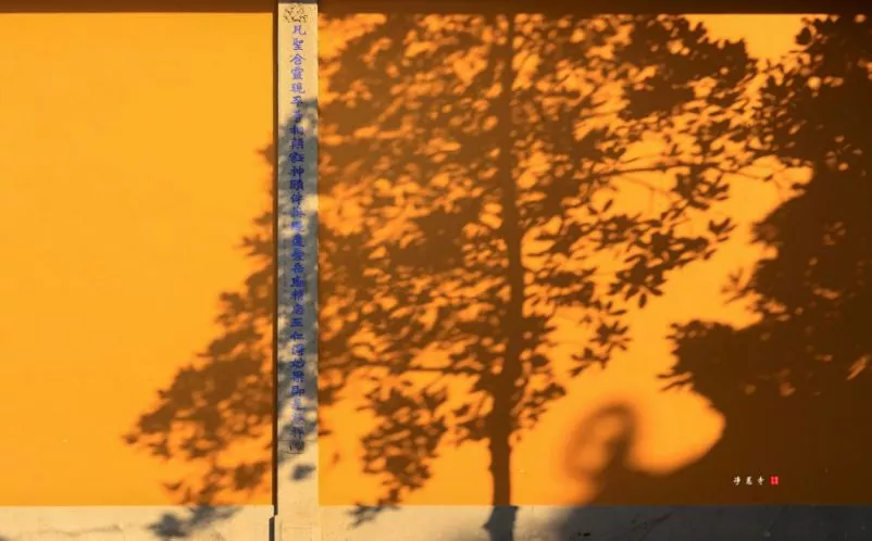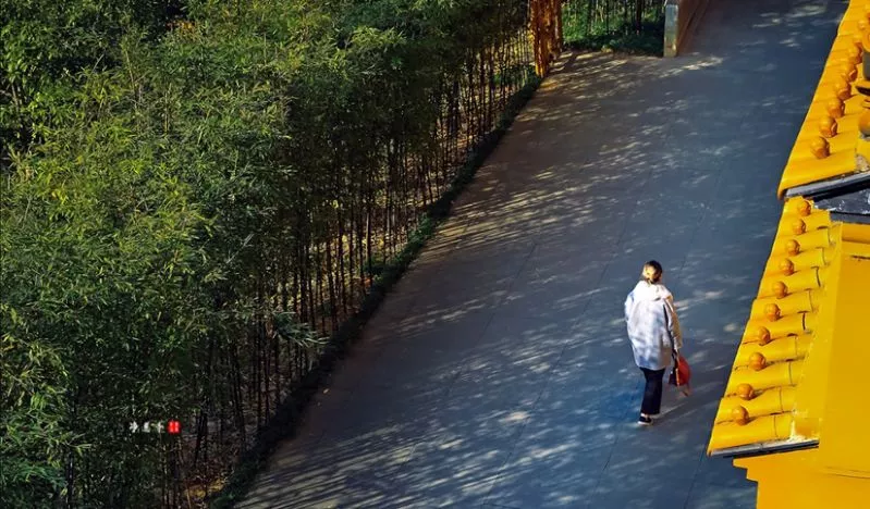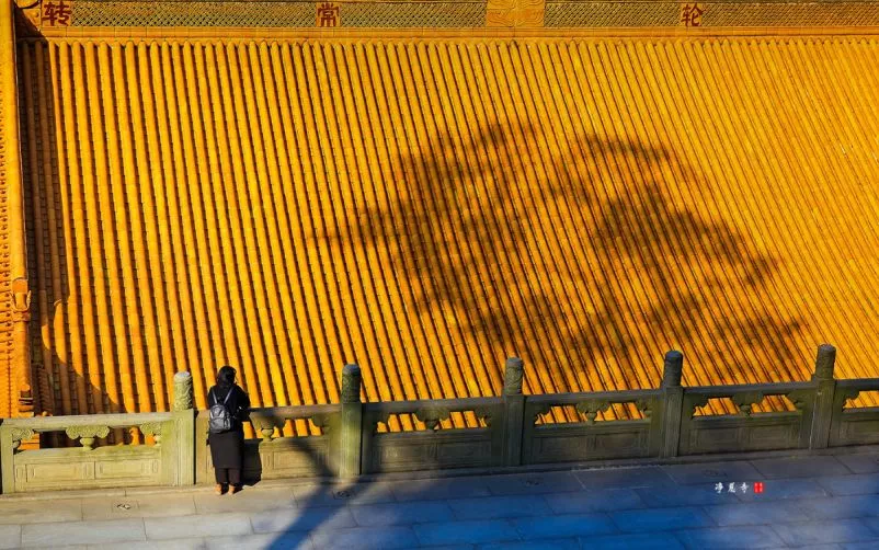 黃昏時(shí)分,一名游客倚在欄桿上,默默注視著香樟樹在凈慈寺黃色琉璃瓦上投下的巨大倒影。