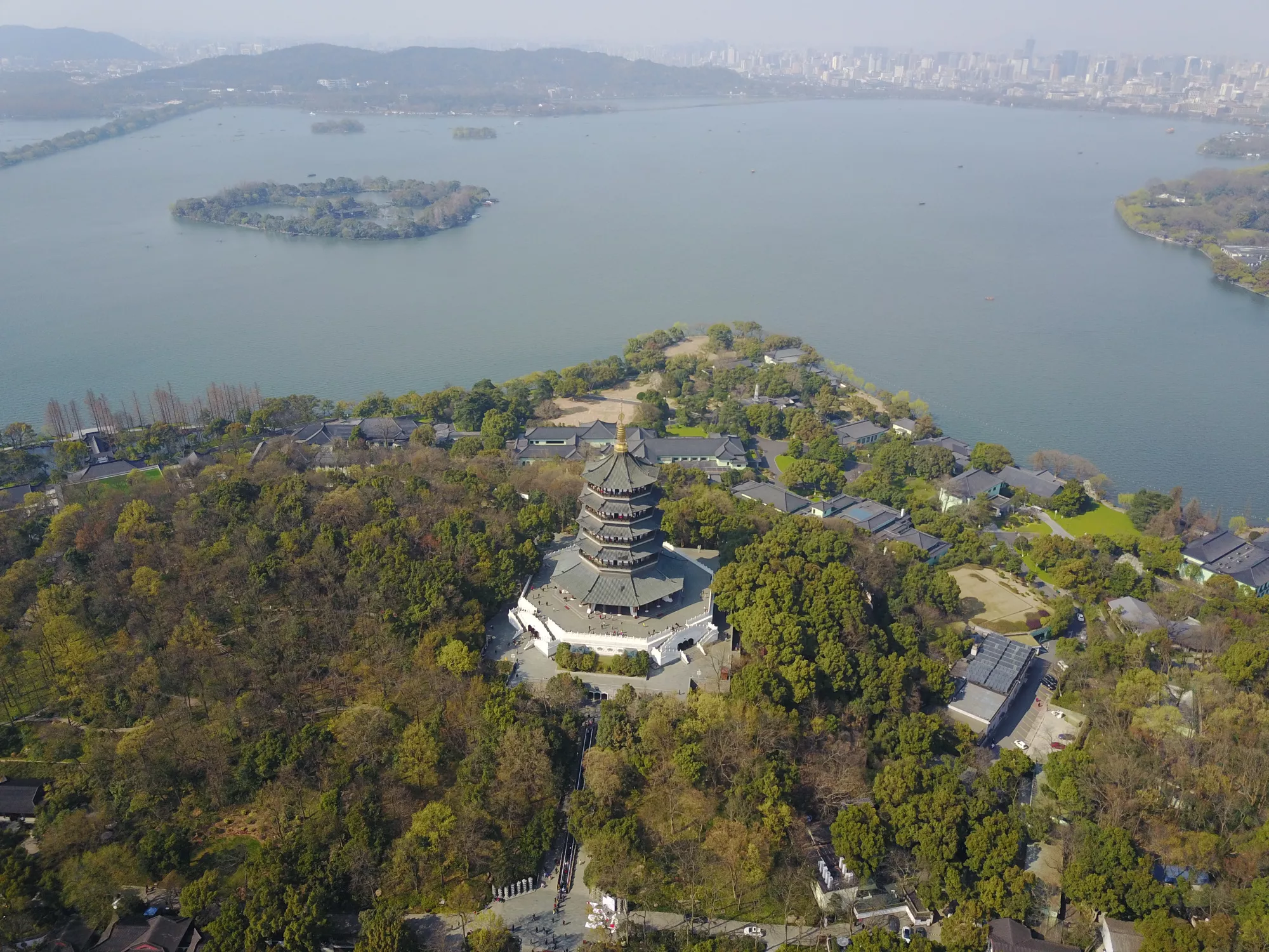站在釋迦殿前遠(yuǎn)望西湖南岸,矗立在夕照山上的雷峰塔清晰可見。