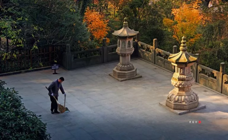 一位師傅正在清掃寺院,看到這幅畫面。我的腦海里不由得想起“掃地僧”的影子來。