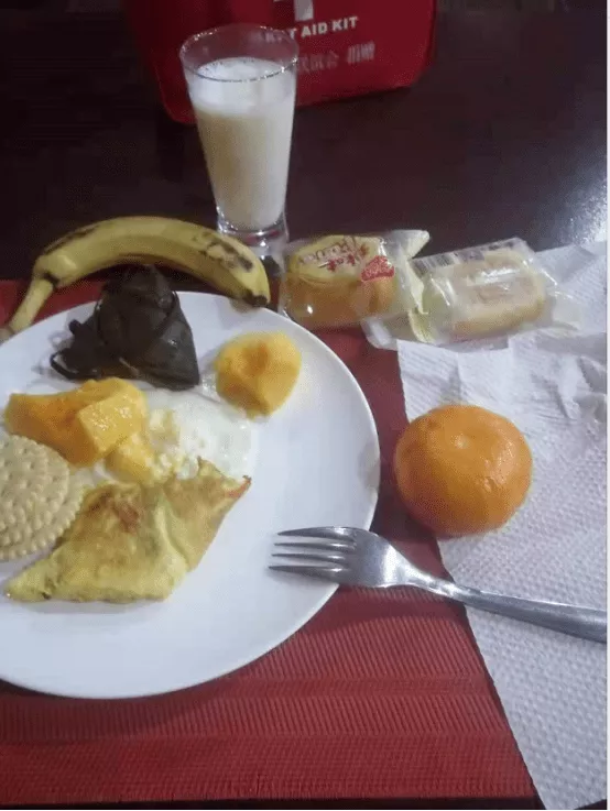 雖然酒店有免費(fèi)早餐,我還是將行李放到車上后,拿了點(diǎn)帶的橘子、香蕉和粽子、面包作為補(bǔ)充。果然,因?yàn)槿松伲ㄎ覙?biāo)注房號的時候順便看了一下房客表,連我們4個人,也只有十來個人),早餐比較簡單,我選了杯熱牛奶,一個煎雞蛋、一小塊雞蛋煎餅木瓜,兩片餅干,加上從車上拿下來的,開始吃了起來。正吃著,黃總他們?nèi)齻€人也拿著行李走了進(jìn)來。三個人吃完早餐,把行李重新裝車?yán)^續(xù)向盧班戈出發(fā)。