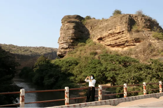 途中,經(jīng)過一座小橋,左面是兩座山夾著河道形成的峽谷,河水流過了橋便是在兩岸蔥郁綠色環(huán)擁下的河道。遇此美景,自然不能錯過。只是從昨天開始就拉肚子的項海英此時已經(jīng)沒精神參與我們的拍照行動,只能乖乖地留守看車。