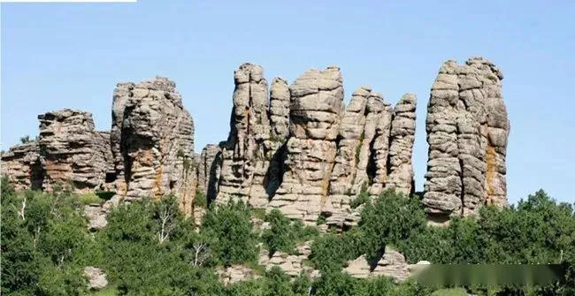 在大興安嶺支脈的北大山上,有奇特的花崗巖地貌景觀,花崗巖石林地貌群形態(tài)各異,發(fā)育密集的水平節(jié)理和垂直節(jié)理。水平節(jié)理的發(fā)育一方面使巖體內(nèi)部的應(yīng)力得到釋放,避免了斜交節(jié)理在重力作用下使巖石崩塌倒伏,另一方面水平節(jié)理又大大減緩了冰劈作用。疏密不同的垂直節(jié)理把巖體分割成抗風(fēng)化能力不同的巖塊,最終演變成花崗巖石林。