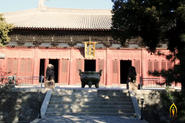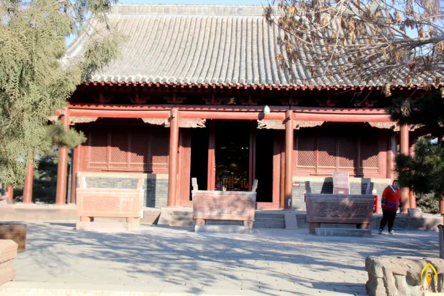 繼續(xù)前行是天王殿,為單檐歇山頂,面闊三間,進(jìn)深兩間,通面闊16.14米,通進(jìn)深12.22米。始建于金代天眷三年(1141年),原名萬壽殿,后改為無量殿,清康熙四十九年(1710年)重修。近代按照漢傳寺院傳統(tǒng)格局為依據(jù),更名為天王殿。