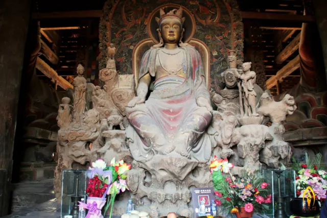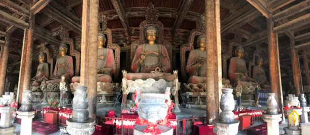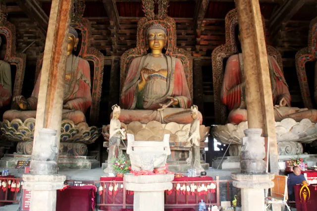 大雄殿是中國古代建筑中最大的單層木結(jié)構(gòu)建筑,被譽(yù)為“中國第一大雄寶殿”。大雄殿筑于高3米的臺(tái)基之上,為五脊單檐廡殿式,面闊九間,長48.2米,進(jìn)深五間,寬25.13米,高達(dá)21米,建筑面積1829平方米,是佛教頂級建筑,殿內(nèi)主供七尊大佛為原汁原味的遼代塑像,由東至西依次為迦葉佛(貴人佛、成就佛)、拘留孫佛(平安佛)、尸棄佛(健康佛)、毗婆尸佛(興業(yè)騰達(dá)佛、智慧佛)、毗舍浮佛(招運(yùn)佛、發(fā)財(cái)佛)、拘那含牟尼佛(光明佛)、釋迦牟尼佛(佛教創(chuàng)始人),七佛皆端坐于須彌座上,通高9米以上。尤以正中的毗婆尸佛最高,合座高達(dá)9.5米。因“過去七佛”并列一堂,佛祖釋迦牟尼偏居其中,為佛教界獨(dú)一無二。另外,每 尊佛前左右各有一脅侍菩薩相對而立,高2.5米,共14尊。諸菩薩或仰或俯,或斜立或平視,兩足踏蓮花一朵。寶相莊嚴(yán),栩栩如生。