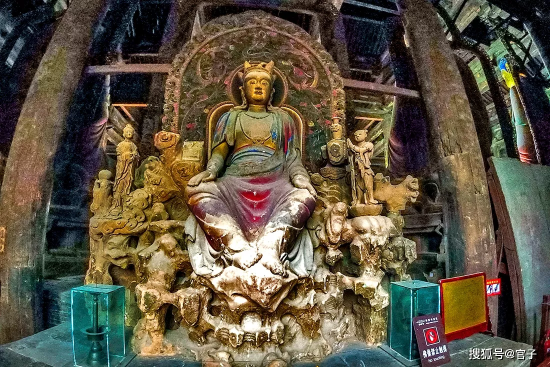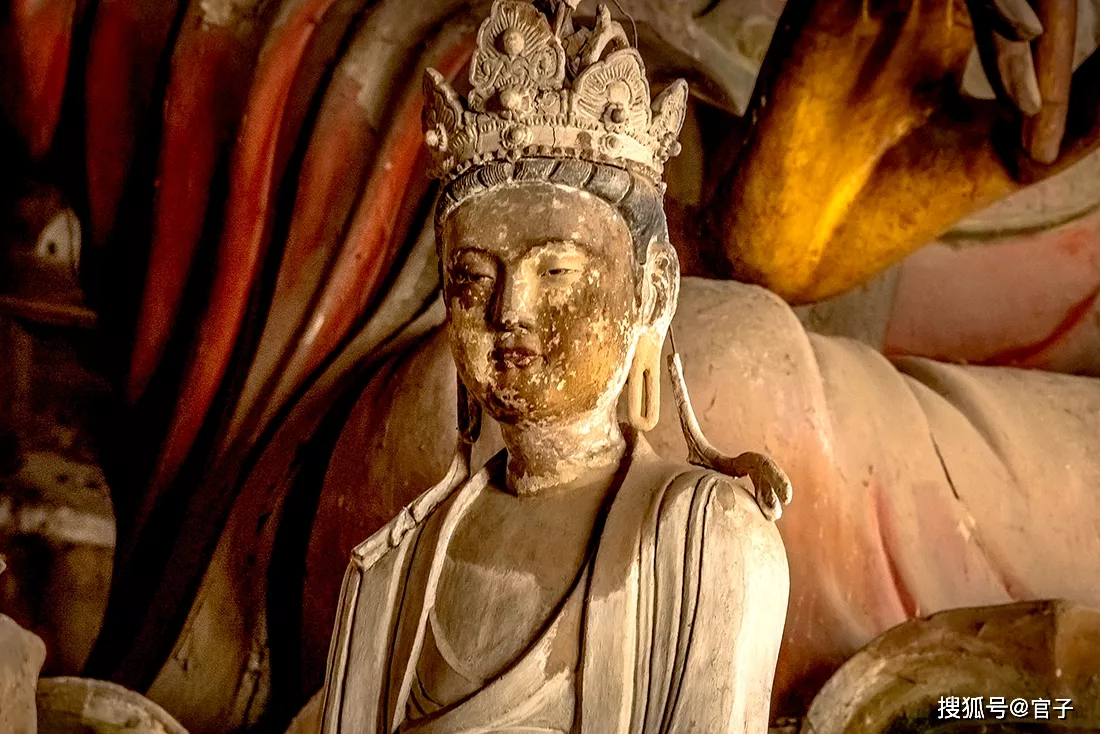 七佛的背后是倒坐觀音,由章子怡主演的《一代宗師》電影就在這里取過景,這是一尊男相觀音,十分少見。我在央視電視《國家寶藏》中看介紹,在觀音兩側(cè)除了善財(cái)和龍女還有一鷹與一凈瓶,又稱“鷹瓶觀音”,這種圖像模式的觀音并不多見。不過,這次我真的仔細(xì)找了很久,不知這只鷹什么時(shí)候飛走了?