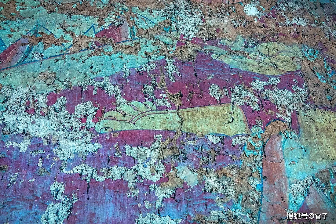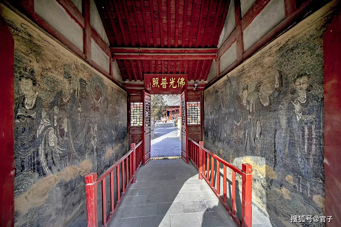 殿內(nèi)的三面墻上都繪有壁畫,東西兩側(cè)為元代作品,正面墻上原畫十八羅漢,是明代時(shí)期的作品,上世紀(jì)80年代修繕時(shí)被揭取下來,現(xiàn)保存在大殿后面。元代壁畫破損嚴(yán)重,這就是歲月?lián)崦暮圹E。