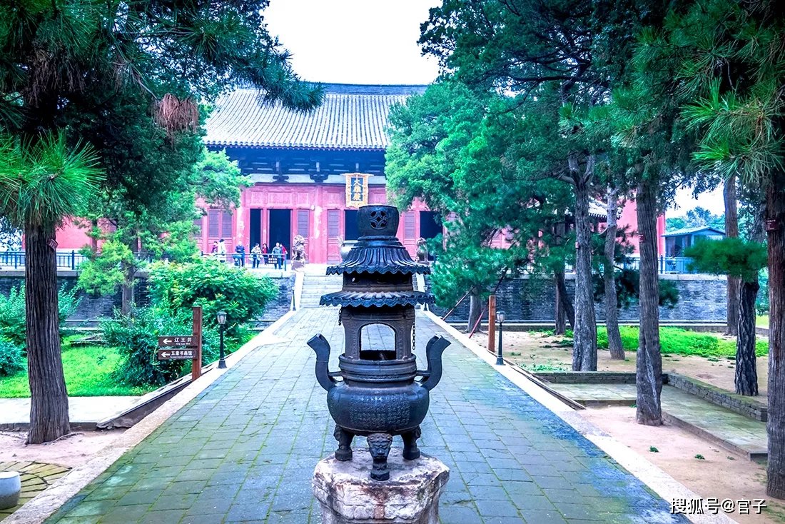 步入景區(qū),進(jìn)入視野的是層次錯(cuò)落的古建筑,前面的山門、牌坊、天王殿均為明清建筑風(fēng)格,最高大的那棟古建筑與前面的建筑風(fēng)格明顯不一樣,尤其是巨大的飛檐斗拱,頗有《詩經(jīng)·小雅·斯干》中“如鳥斯革,如翚斯飛”的風(fēng)采,氣宇軒昂,一下子就吸足了眼球。