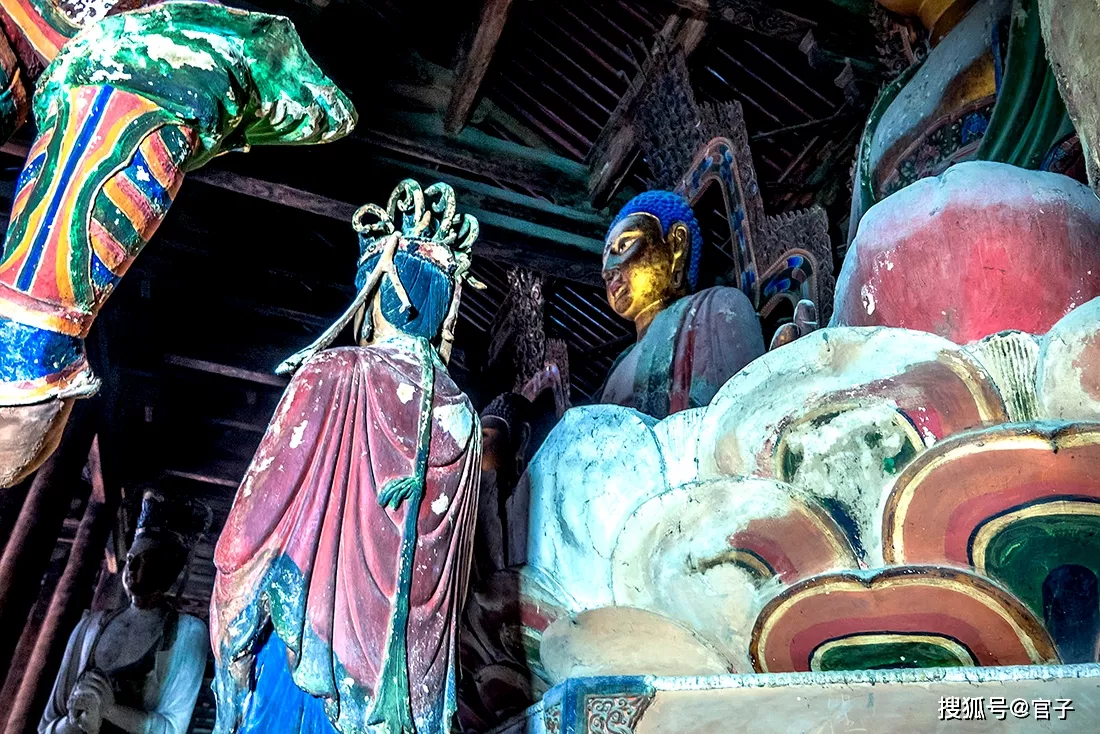 佛壇東西兩端,對塑天王像一尊,高3.5米,拄杵昂首,剛勁威武。更為神奇的是在毗婆尸佛背后供有明代所塑的倒坐觀音,塑像保留著唐朝以前男像觀音的風(fēng)韻。