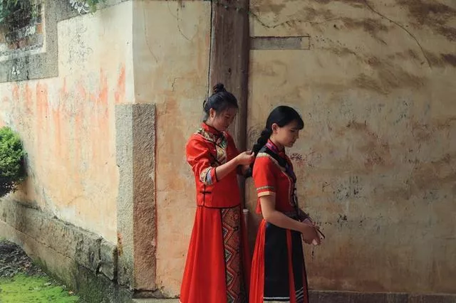 兩個土家族的姑娘,一個在幫另外一個纏繞馬尾。這里的姑娘大部分的都是土家族的,淳樸美麗,歌喉更是動人。