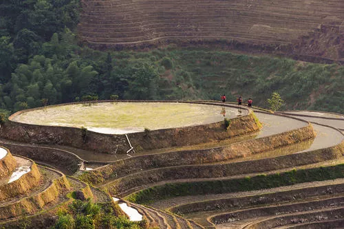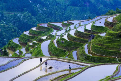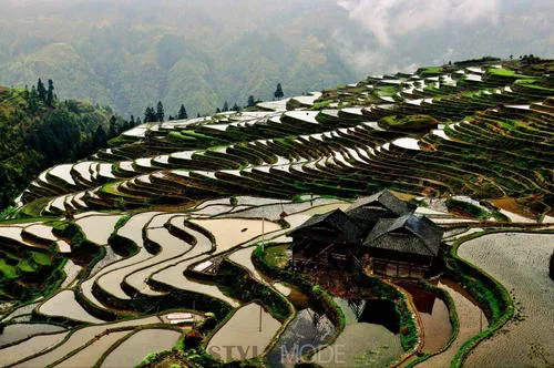 注水后的梯田會(huì)閃現(xiàn)出銀白色的光芒,更凸顯出梯田的婀娜曲折的輪廓,連同散落于田間寧?kù)o的苗家吊腳樓,又構(gòu)成了一幅幅美麗的中國(guó)山水畫(huà)。