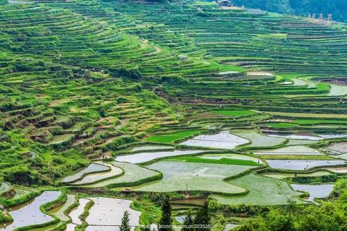 站在山腰,放眼望去,密密麻麻的梯田,就象串串珍珠點(diǎn)綴大地,又如顆顆明珠灑落人間。