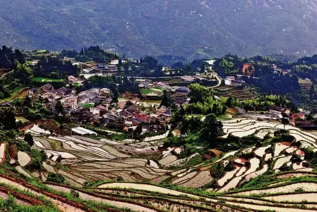 在海拔千米的高山上,梯田如鏈似帶,層層疊疊,高低錯(cuò)落,壯麗雄奇,水面映著藍(lán)天和古樹(shù),遠(yuǎn)眺粉墻黛瓦掩在黃花綠樹(shù)間,陣陣云霧飄來(lái),恍若天上人間。