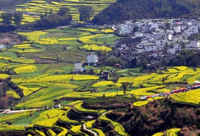 江西婺源素有中國(guó)最美鄉(xiāng)村之稱(chēng),春天緩坡上大片金黃的油菜花和秋冬長(zhǎng)溪村的紅葉令很多人心馳神往。在海拔千米的高山上,梯田如鏈似帶,層層疊疊,高低錯(cuò)落,壯麗雄奇;水面映著藍(lán)天和古樹(shù);梯田下面,山窩里藏著一小撮粉墻黛瓦分外溫柔可親。這是婺源田園風(fēng)光的代表。在每年清明前后,江嶺梯田里開(kāi)滿(mǎn)了金燦燦的油菜花,場(chǎng)面美不勝收。