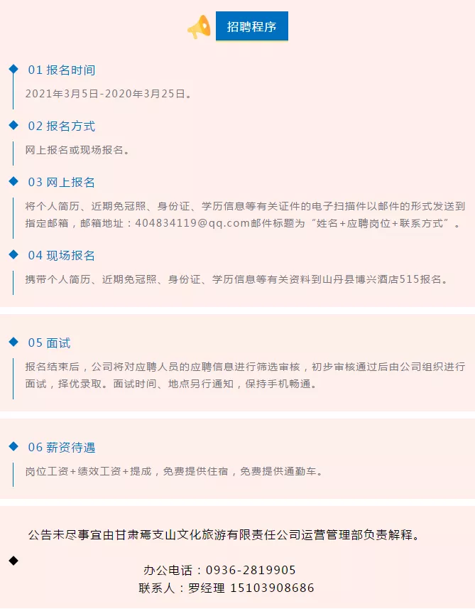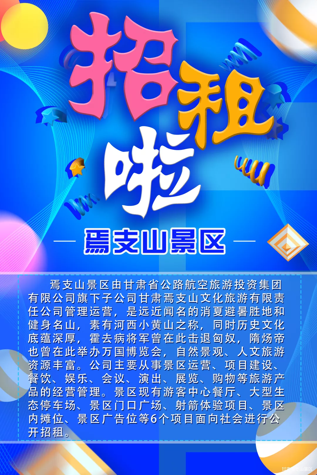 焉支山景區(qū)門口廣場占地面積3000㎡,為游客出入景區(qū)的必經(jīng)之路,地理位置優(yōu)越人口流量大,可用來經(jīng)營娛樂設(shè)備,也可用來舉辦趕集、交易會(huì)等活動(dòng)?,F(xiàn)面向社會(huì)招租,可個(gè)人整體承包、也可多人聯(lián)合承包。