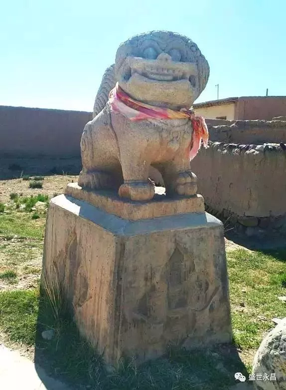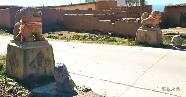 在永昌縣紅山窯鄉(xiāng)高古城村六社村莊中唯一的十字路口,東西走向的馬路兩側(cè)雄踞著兩只石獅。村莊中的外來客人,大都由東進(jìn)入,兩只石獅也就被村民們安置為坐西朝東向,一來是寓意迎賓,二來也有據(jù)守重要路口之意。相當(dāng)一段時(shí)間以來,這對石獅一南一北相向而立于現(xiàn)在所處位置以西十幾米處。2012年,村莊中修建了水泥馬路,村民們把石獅請到了十字路口。