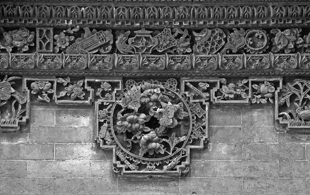 磚雕,以青磚為基,匠人根據(jù)不同的建筑部位,以技法將山水、花卉、人物等圖案雕刻在轉(zhuǎn)石上,與磚墻渾然一體,具有很強(qiáng)的裝飾效果。