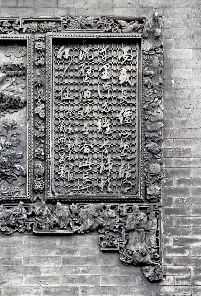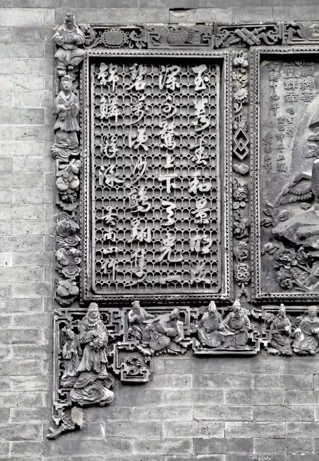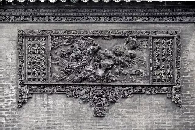 其中“百鳥圖”和“五倫全圖”兩幅磚雕還雕有不同字體的詩文,用磚雕來表現(xiàn)古代書法作品是磚雕藝術(shù)和書法藝術(shù)的巧妙結(jié)合,使典雅的書法和精美的磚雕相得益彰,也是陳家祠磚雕的一大特色。