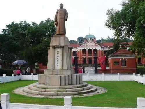閱馬場孫中山銅像在辛亥革命武昌起義軍政府舊址(紅樓)大門前,矗立著一尊孫中山銅像。孫中山銅像身著中國傳統(tǒng)服裝長袍馬褂,左手持有禮帽,右手手握拐杖,背襯紅樓懸掛著的十八星旗,莊嚴(yán)肅立,持重安詳,目光炯炯,與黃興拜將臺遙遙相望。