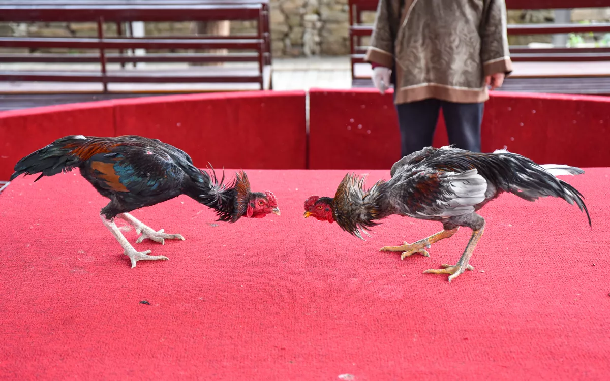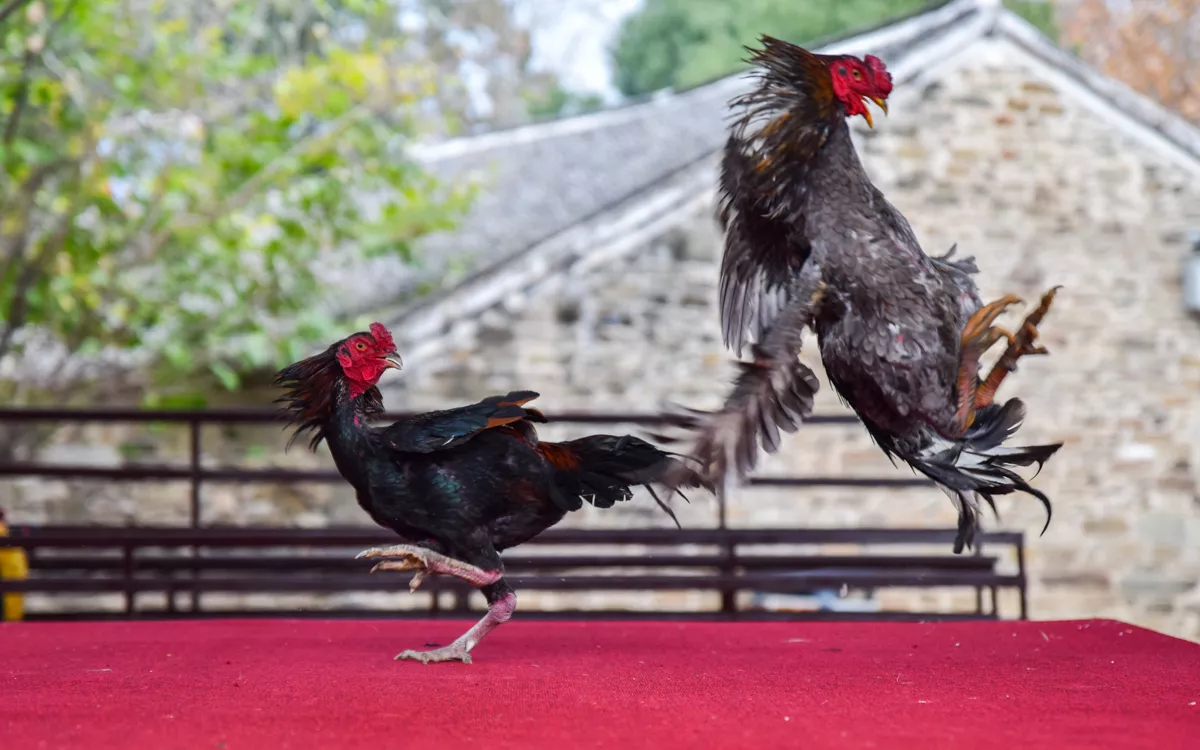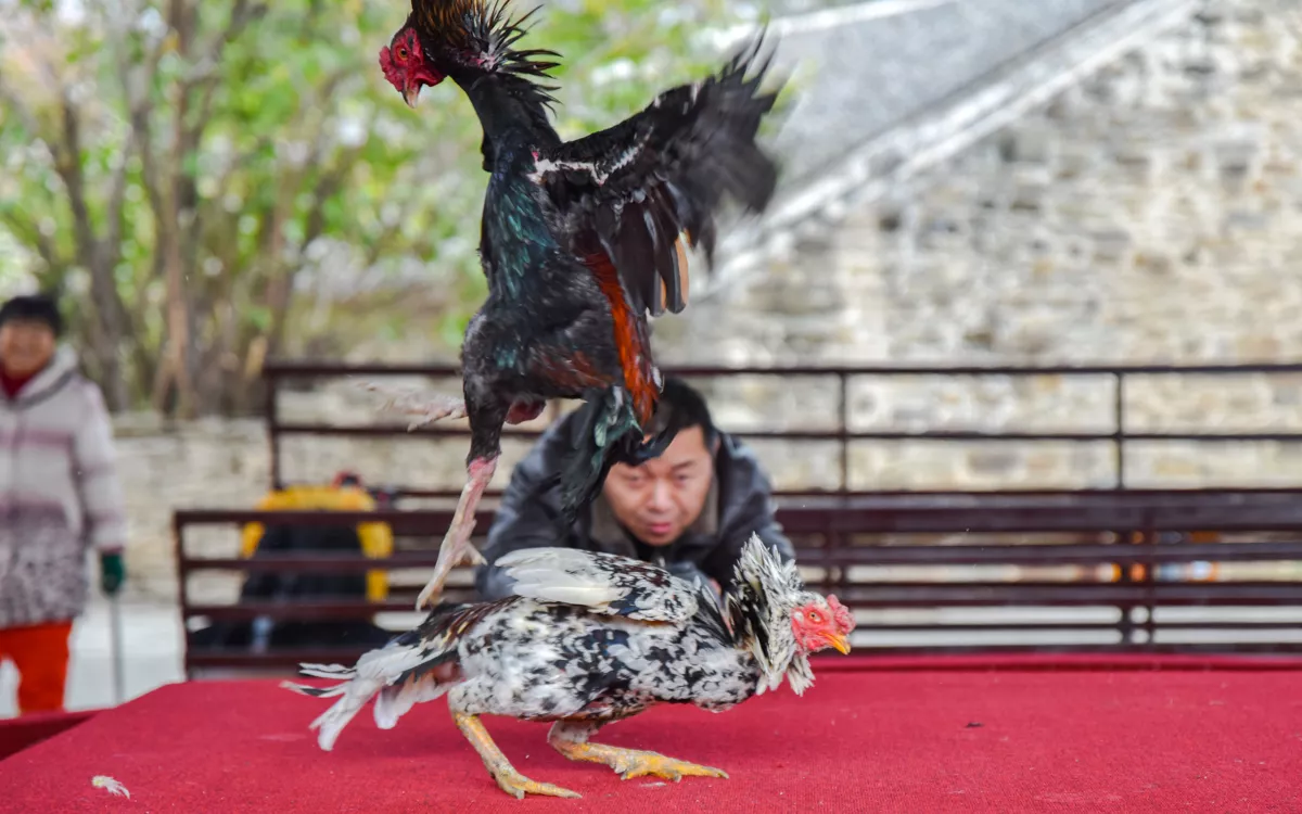 遠(yuǎn)渡重洋來自越南的“戰(zhàn)斗雞”中的戰(zhàn)斗雞表演。精彩絕倫,爭斗激烈。兩只公雞開斗前,雄赳赳,劍拔弩張之時,雷霆萬鈞之勢,突然一記猛啄、一次騰飛,把另一方踩在腳底。在緊接著一陣電閃雷鳴版的飛斗,一方突然敗下陣來,掉落臺下。但弱勢一方,毫不言敗,繼續(xù)撲騰。整個過程三分多鐘,卻讓游客,看的目不轉(zhuǎn)睛。贏得陣陣喝彩。此外,古村落還有古戲臺表演雜技,還有木偶戲,可謂傳統(tǒng)文化的傳承。