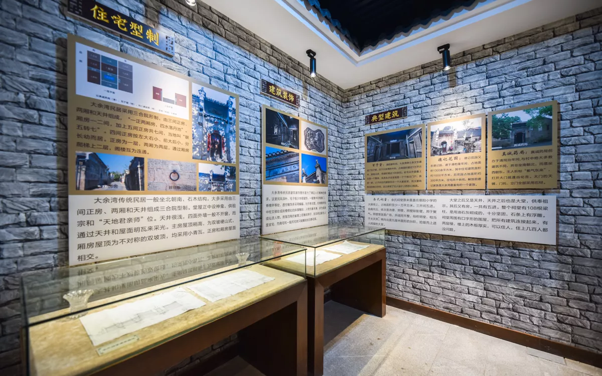 大余灣整體布局奇特,75棟明清古建筑遍布,大多數(shù)古民居外墻上遺留著清代手繪彩色壁畫,計有上千幅。站在村后舊寨山上鳥瞰全村,在形式和格局、用材與技術(shù)上,體現(xiàn)出極為完整的安居構(gòu)想:“前面墻圍水,后面山圍墻。大院套小院,小院圍各房。全村百來戶,穿插二十巷。家家皆相通,戶戶隔門房。方塊石板路,滴水線石墻。室內(nèi)多雕刻,門前畫檐廊?!?古宅均用大塊大塊裁打得方方正正的條石砌成,石面上琢有細(xì)致入微的滴水線。硬山頂、翹檐、檐額彩繪、天井、承水池、木雕隔屏、清式架子床、清式扶手椅,一切都古色古香。