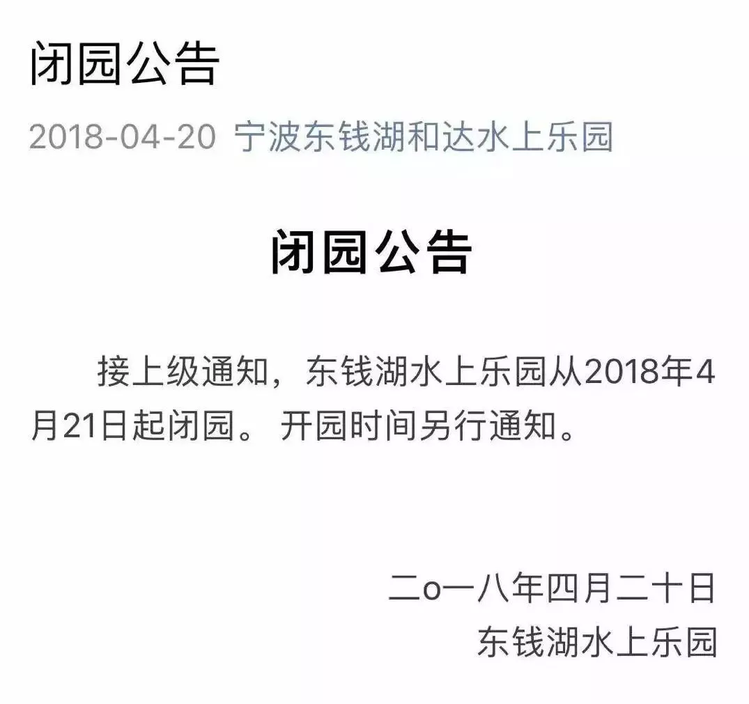 這幾天,寧波天氣是越來越熱了,本該是水上樂園開園之際,但就在昨天傍晚,東錢湖水上樂園官方微信號(hào)發(fā)布了閉園公告: