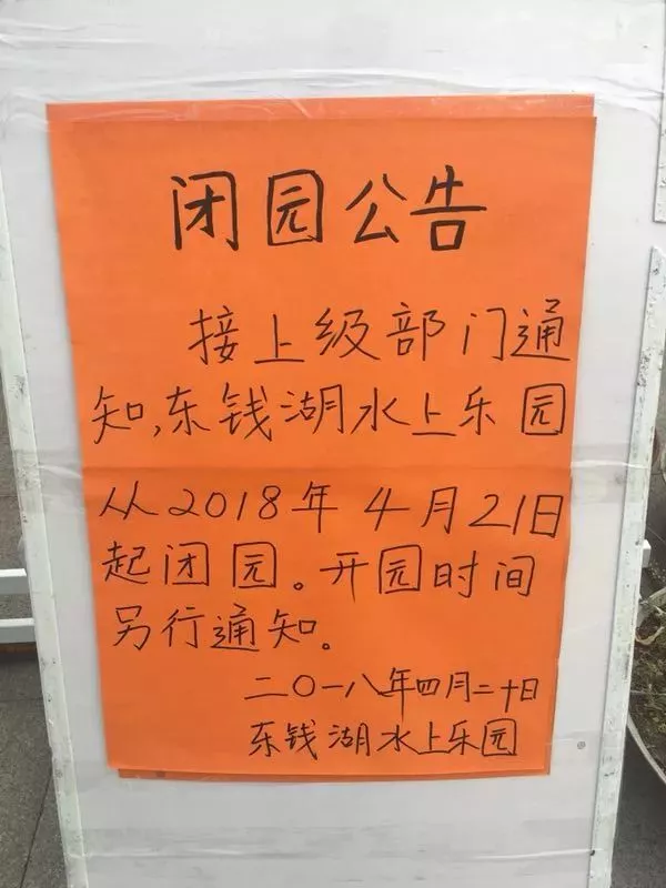 今天上午,《看看看》記者來到東錢湖水上樂園,發(fā)現(xiàn)園區(qū)大門口立起了閉園公告:園區(qū)從今天起閉園,開園時(shí)間另行通知。