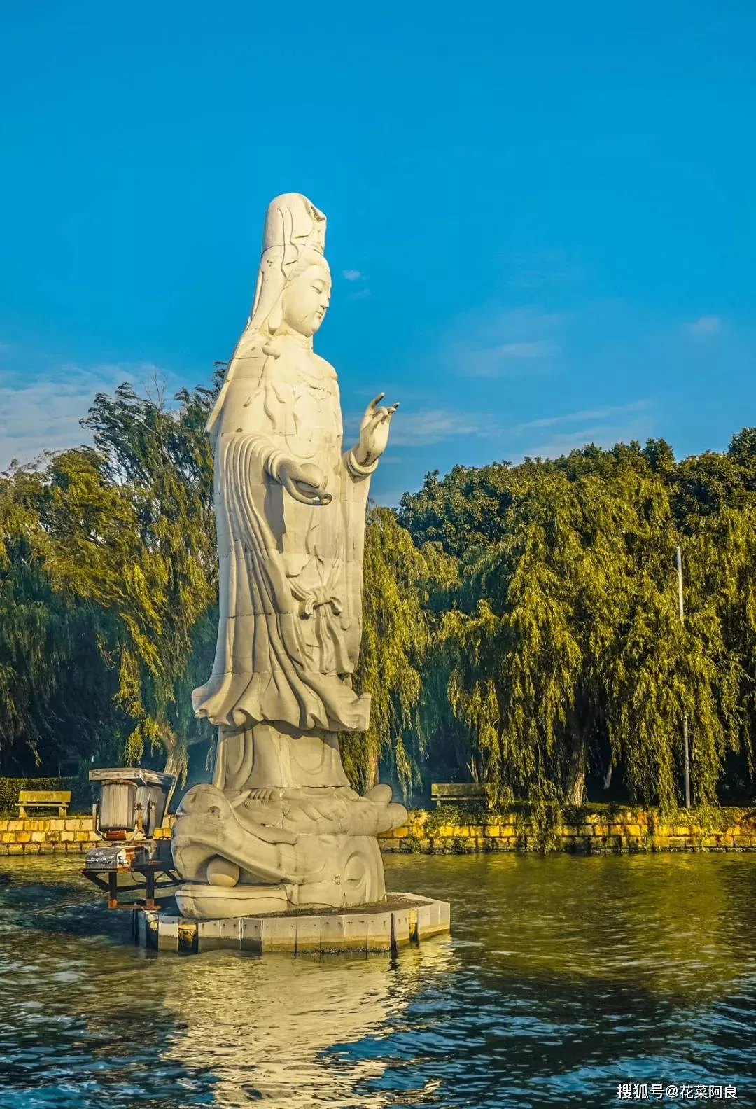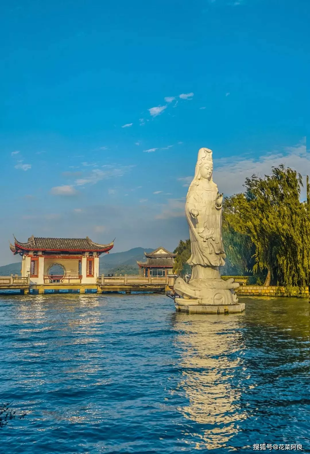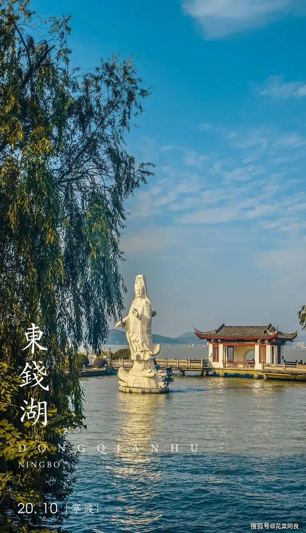 夕陽暖陽照在觀音像之上,折射出朦朧的感覺。水中的倒影將觀音像襯托著飄逸出塵,宛若一朵潔白蓮花,立于東錢湖湖心之上。