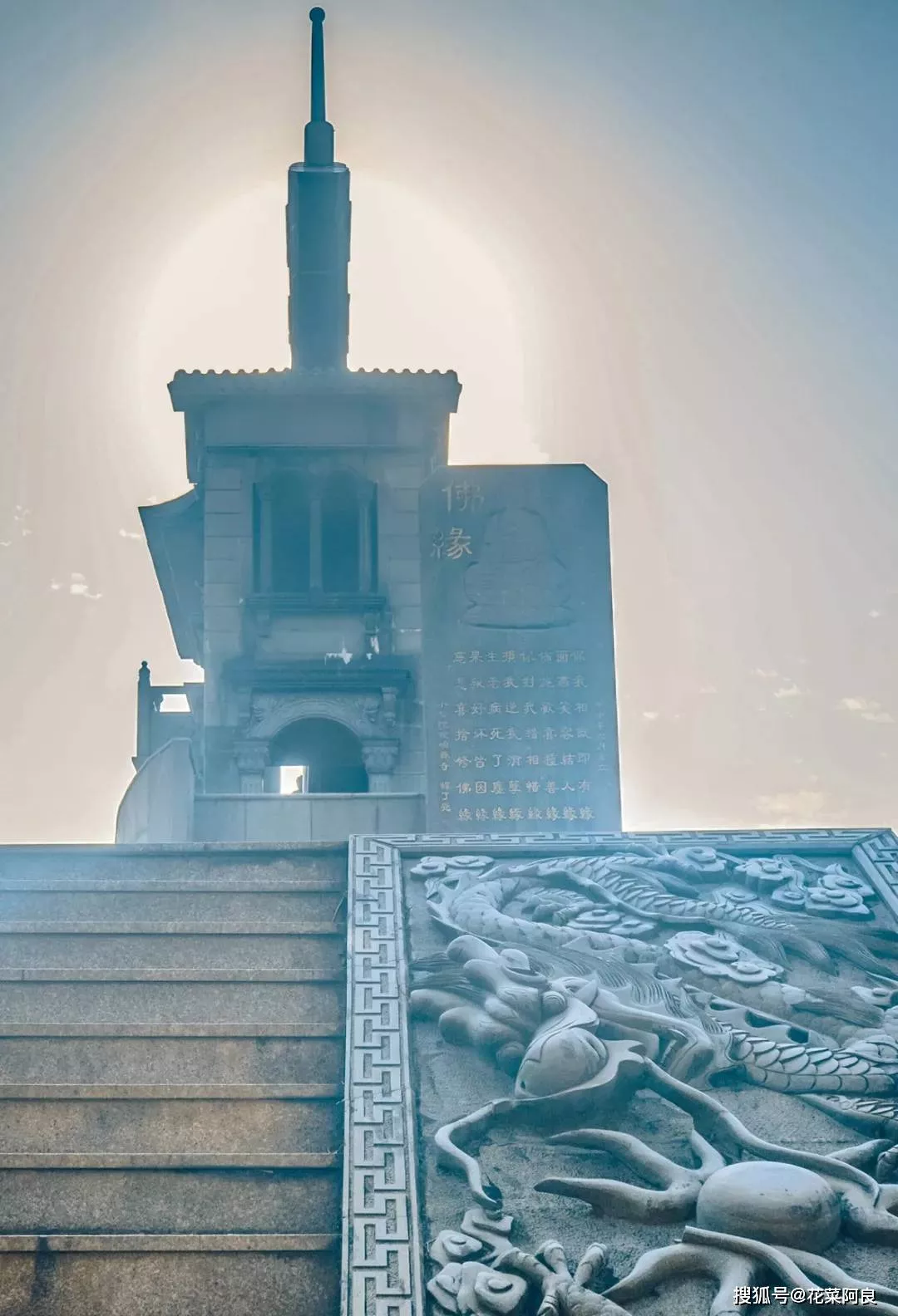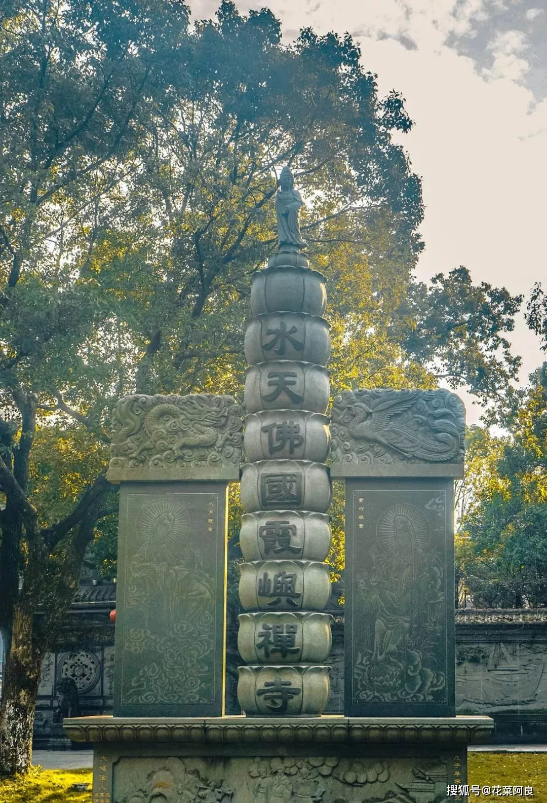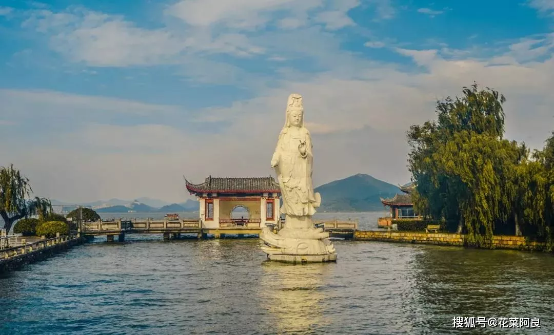 霞嶼禪寺東門的湖邊上,立有一尊十米高的水月觀音,取山東雪花白花崗石雕琢而成,通體雪白。觀音手執(zhí)凈瓶,慈祥寧靜,眉目低垂,腳踏龍子,以瀲滟水色為蓮,青山綠意為景,站立于微波的湖水之上。