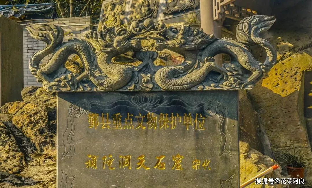 洞口刻有秦篆“補(bǔ)陀洞天”四字。“補(bǔ)陀落伽山,此云海島也”。補(bǔ)陀和普陀同意,故此處也意指觀音道場(chǎng)。整個(gè)洞內(nèi)并不長(zhǎng),約四十多米,洞內(nèi)供奉石刻觀音像和觀音龕像。所以亦稱其為觀音洞。洞口上方置有一方亭臺(tái),上面立有南海觀音、金童玉女形象。