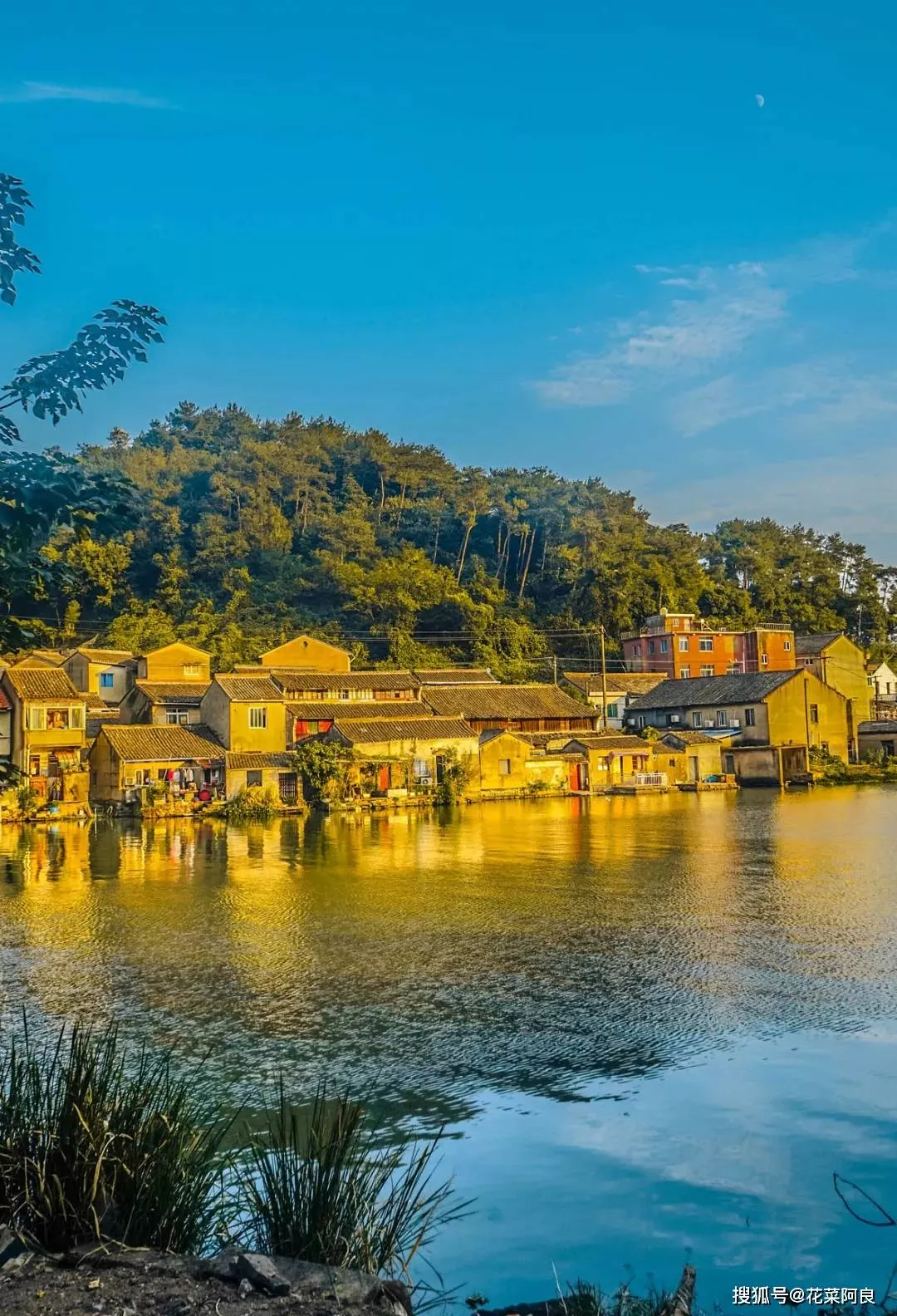 沿著湖邊走在鄉(xiāng)村小道之上,寬廣的湖面之上,青山綠意連綿一片,山腳處平靜的湖水,倒映著青山古村,微起漣漪,甚為動(dòng)人。此時(shí)的湖面水平如鏡,錯(cuò)落的古村被鍍上了一層夕陽的余輝,將其照映的金黃。