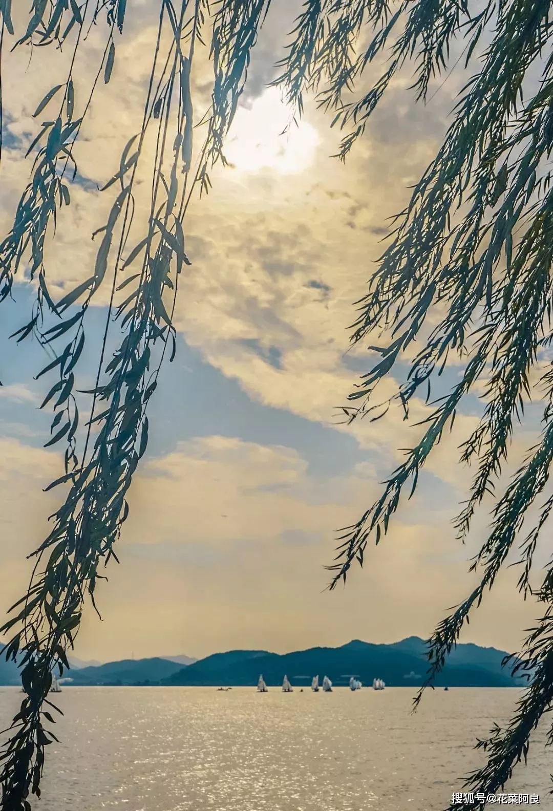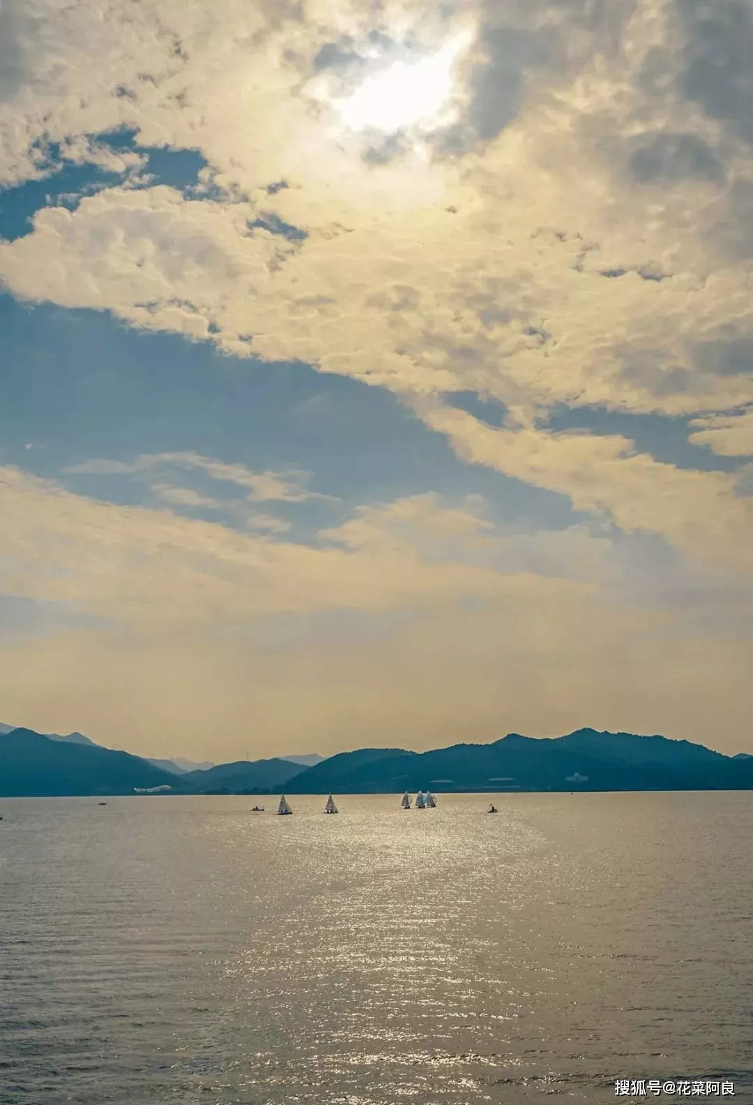 整個(gè)湖面山色空濛,萬點(diǎn)金光,湖上揚(yáng)起點(diǎn)點(diǎn)風(fēng)帆。夕陽照射而下,滿眼銀光水痕,場(chǎng)景頗為震撼。