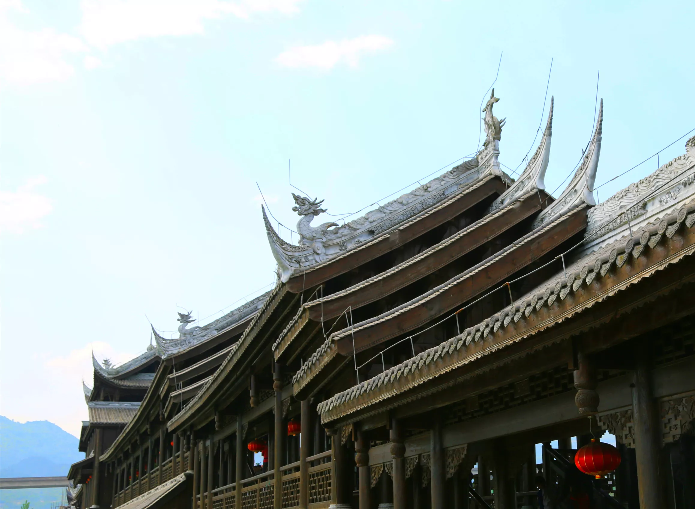 濯水古鎮(zhèn)風(fēng)雨廊橋橋身為純木制結(jié)構(gòu),建筑材料之間以榫頭卯眼互相穿插銜接,直套斜穿,結(jié)構(gòu)牢固精密。橋建有三層塔亭,兩側(cè)有約百扇可自由開(kāi)合的雕花木窗,橋內(nèi)擺放有紅漆長(zhǎng)凳。