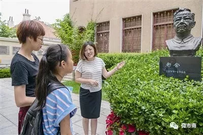 在老舍先生雕塑前,為游客講解老舍先生的往事。