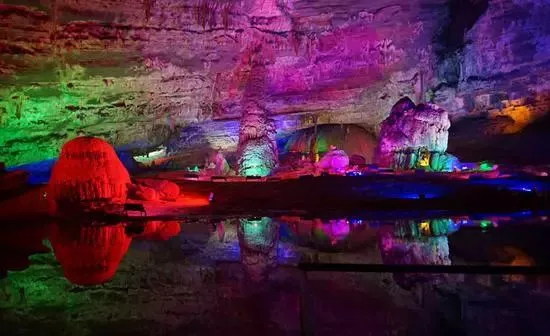前往玉壺洞需要乘坐觀光車,15元/人,此洞因山形似茶壺,進(jìn)的時(shí)候口子小,中間大,并裝滿了水,由此得名玉壺洞。通向出口是一段水路,需坐小舟前往,,短短一程不過十來分鐘,小舟輕揚(yáng),一路上也是風(fēng)光無限。水面兩側(cè)的崖壁上也是姿態(tài)各異的鐘乳石,五彩的燈光照在上面,生生讓人莫名產(chǎn)生一種尋幽探密的感覺來。